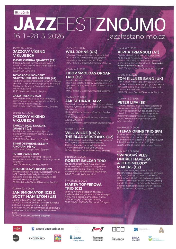 JAZZFEST ZNOJMO - 18. ročník začíná 16.1.2026 a potrvá až do 28.3.2026. Připraveno je pro Vás spoustu dalších hudebních lahůdek různých hudebních stylů ovlivněných jazzem. Od klasického jazzu přes swing, soul, blues nebo rock´n´roll. Vše bude samozřejmě příjemně sladěné s ochutnávkami lahodných vín.